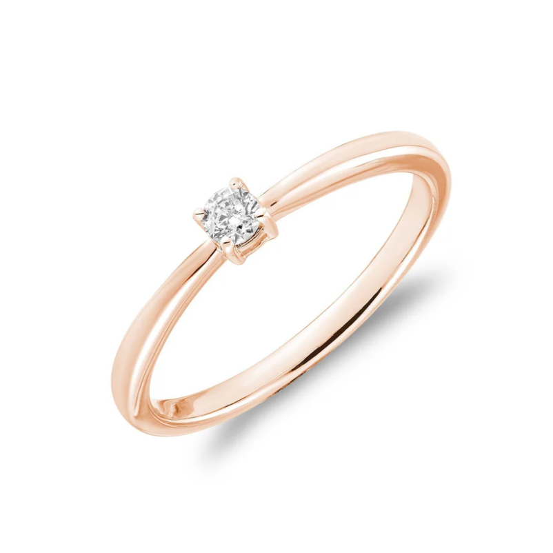 This solitaire diamond ring is crafted in warm 10k rose gold, showcasing a single brilliant diamond. Its minimalist design highlights the stone’s natural beauty, creating a timeless piece that suits any occasion.
