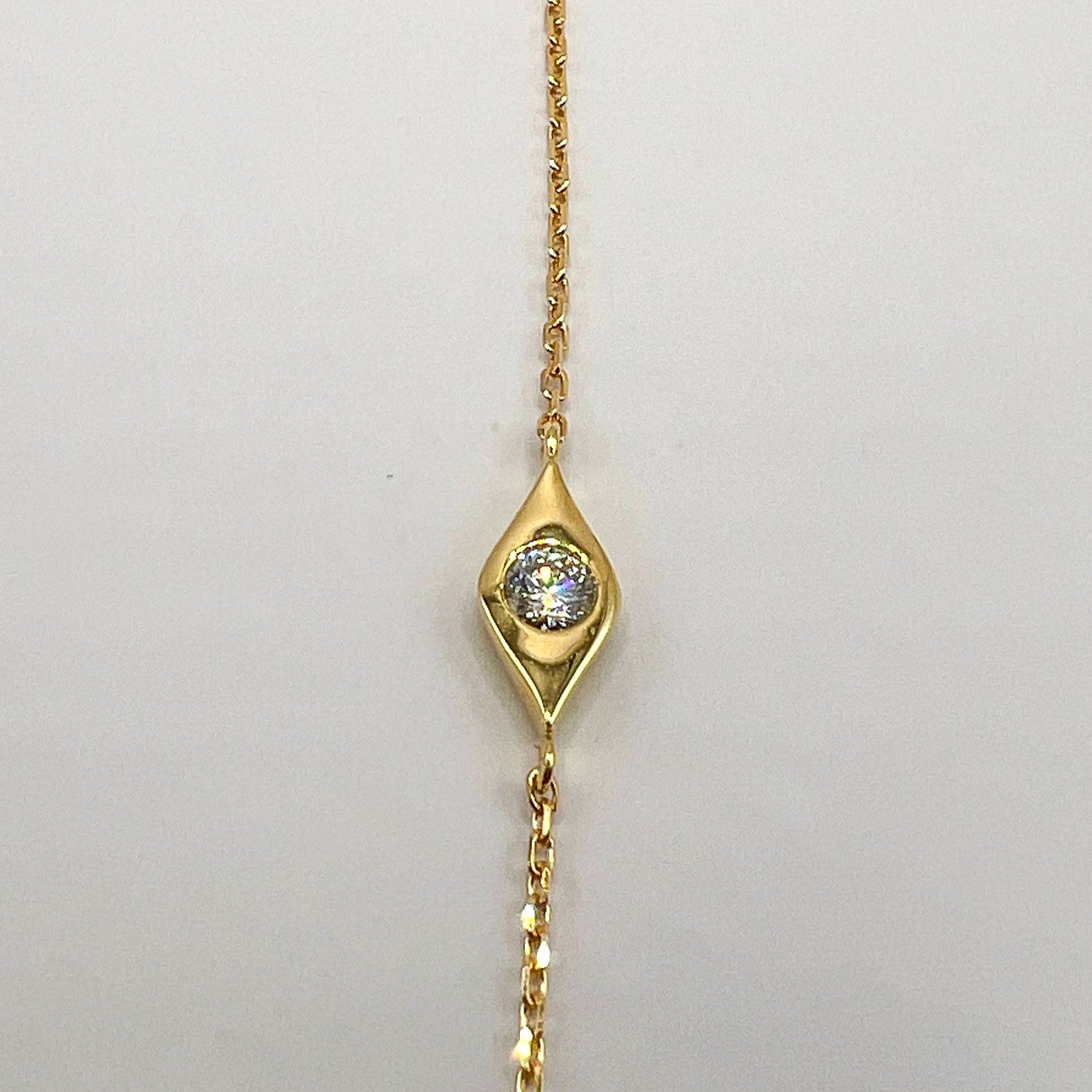 The "Brynn" bracelet is a striking expression of personal style. Crafted in 18k yellow gold, it features a diamond pendant in the shape of an eye—an iconic symbol of protection and presence. With its subtle sparkle and fearless design, this piece adds meaning and edge to any look.