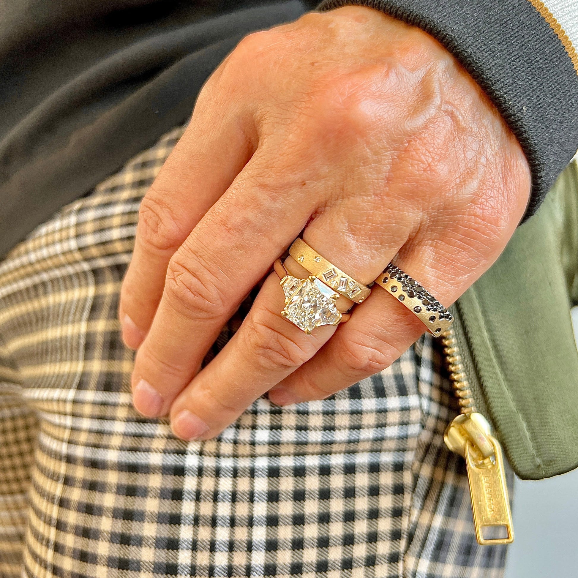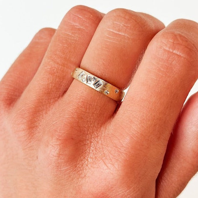 This Dilamani ring is crafted from 14k yellow gold and adorned with a mix of baguette and round diamonds for a dynamic, textured look. The satin finish enhances the gentle glow of the stones, while the flush setting offers a sleek and secure design.