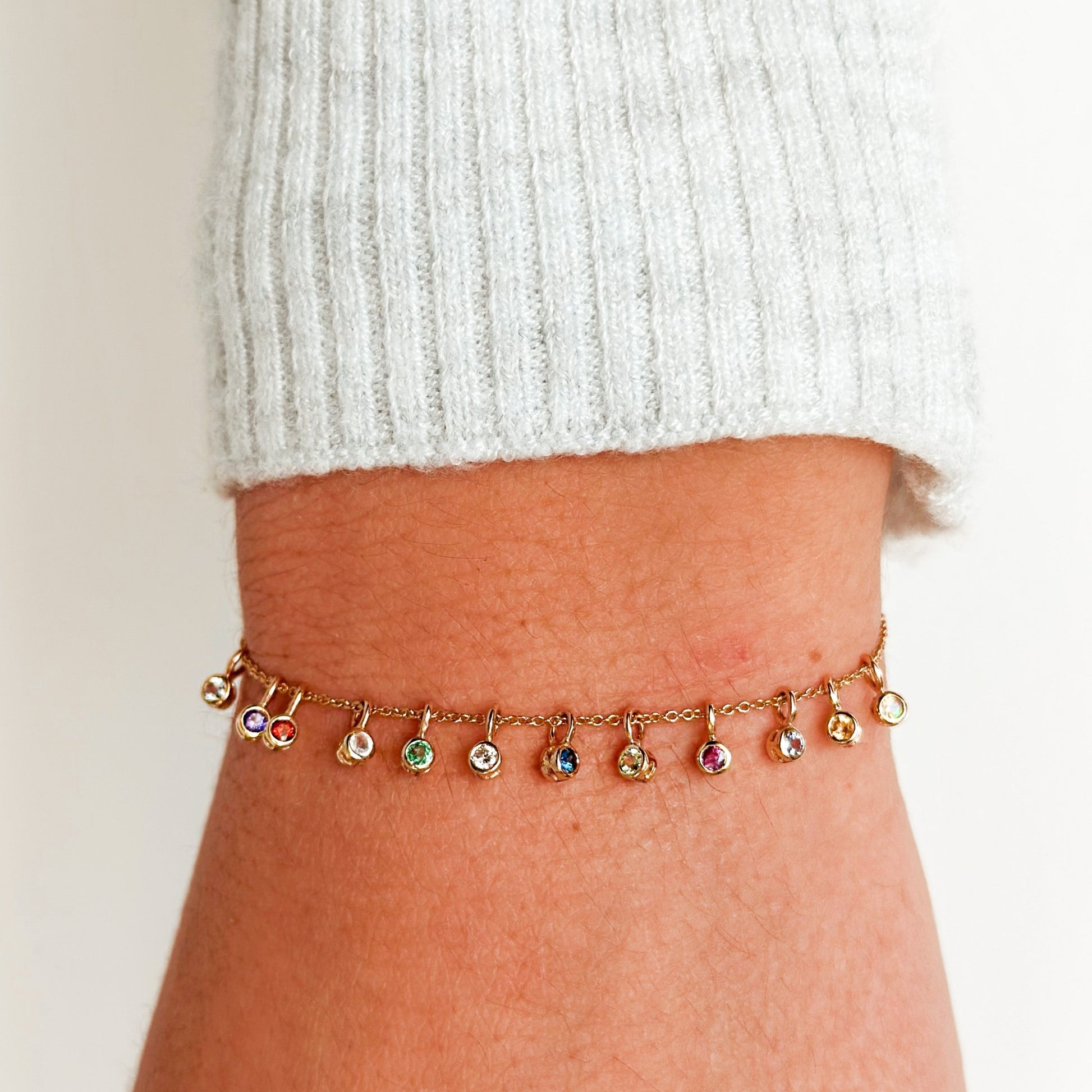 The FUSE by Roset "You're a Gem" charm features a 10K gold round pendant set with genuine gemstones representing all the birthday colors. This thoughtful design makes it a perfect personalized addition to any necklace or bracelet, capturing both elegance and meaningful sentiment.