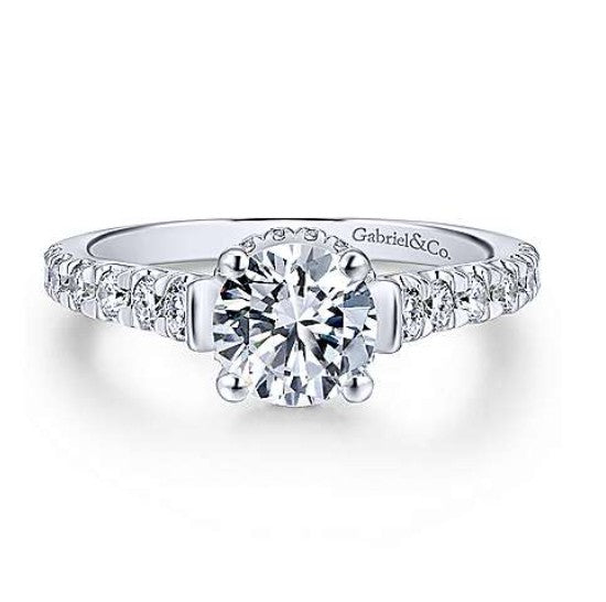 The Gabriel "Matilda" Hidden Halo Round Diamond Engagement Ring is a unique 14K white gold piece that will make you melt. The upper half of the straight and slender shank is adorned with 0.52 carats of SI/GH pavé diamonds, adding a delicate boost of sparkle while keeping the design refined and elegant.