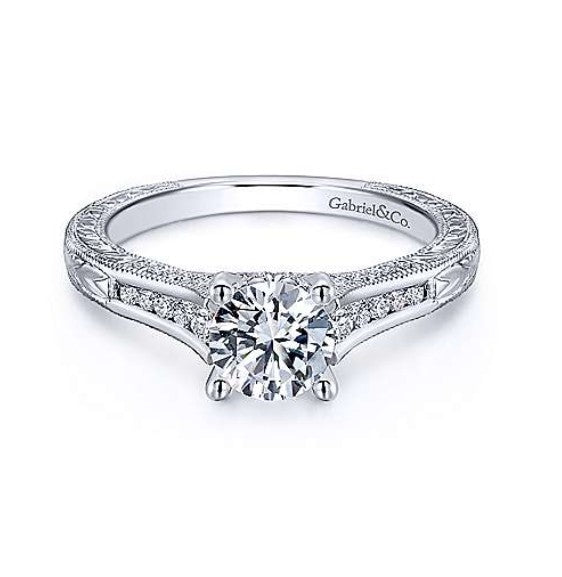 This beautifully detailed engagement ring features strands of graduated SI/GH round diamonds adorning both sides of the polished 14K white gold band. Finished with milgrain edges and delicate engraved details, it offers a timeless, refined look.