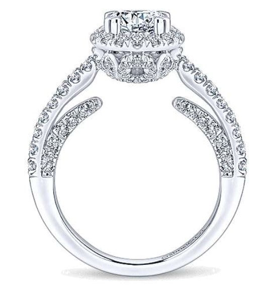 The Gabriel 12950R5 round halo diamond engagement ring showcases exceptional design with distinctive detailing and a radiant halo that frames your center stone. Featuring 0.81ct of SI/GH pavé diamonds, this ring offers a luminous and refined sparkle from every angle.