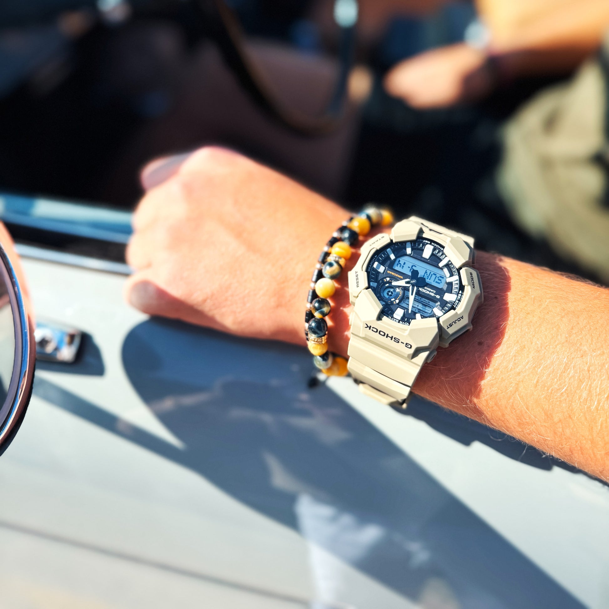 This bracelet pairs the grounding beauty of tiger’s eye beads with the strength of ion-plated stainless steel. Designed for everyday wear, the 8.5-inch length offers a comfortable fit, while the bold contrast of organic stone and modern metal creates a striking, balanced aesthetic.