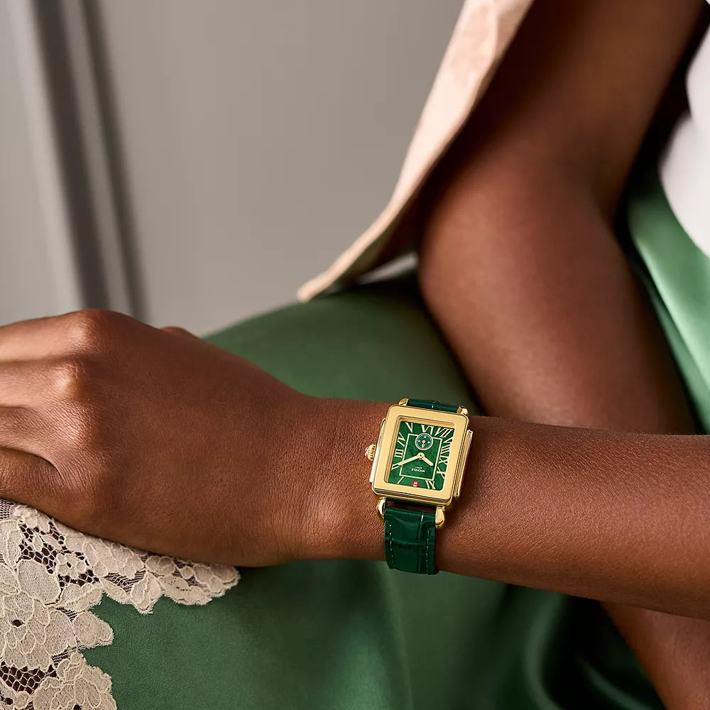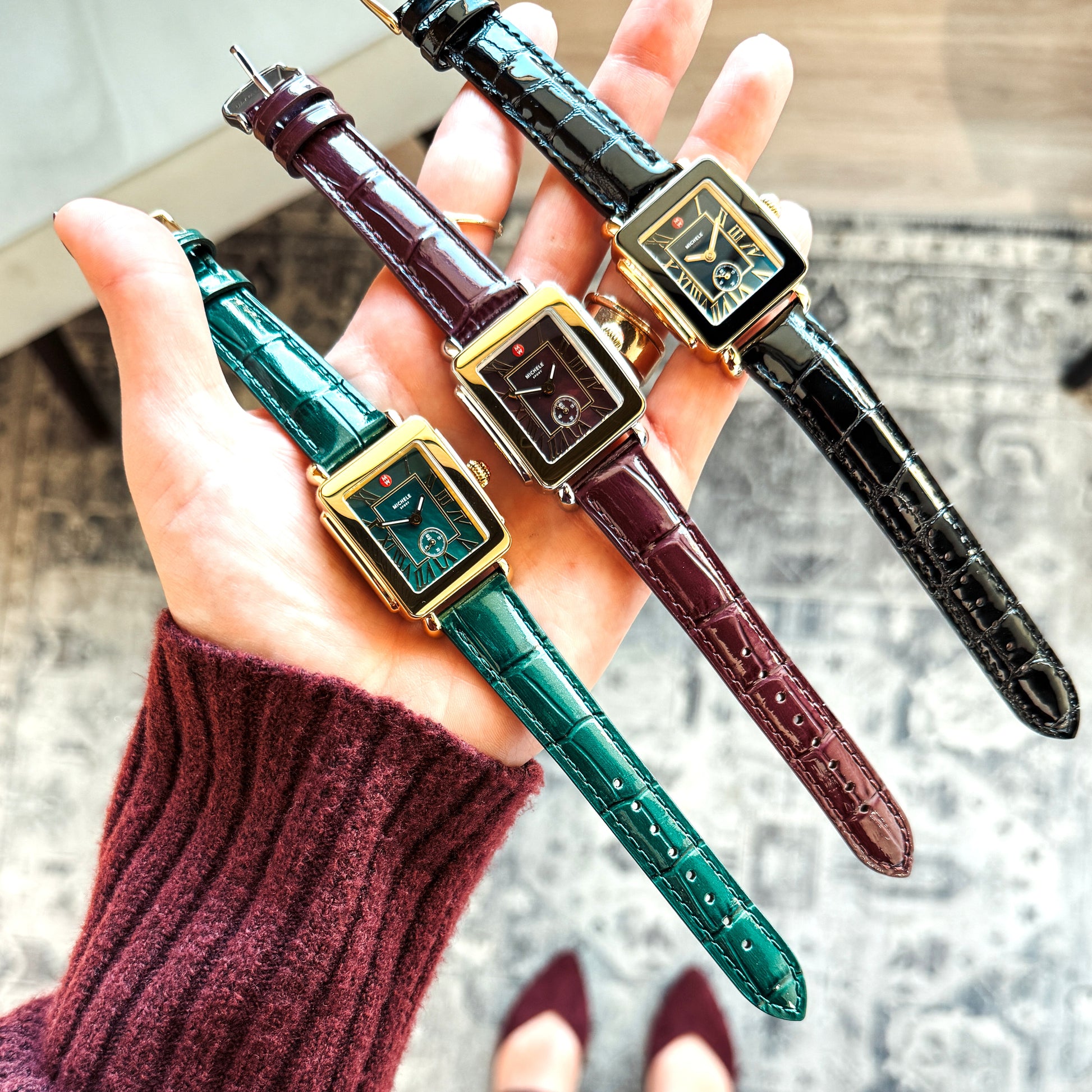 The Deco Mid Sport brings bold color to refined design within a 31 mm rectangular gold-tone and stainless steel case. Polished roman numeral indexes and a sub-second movement complete the sophisticated yet sporty look. Featuring a dark cherry mother of pearl, green mother of pearl, or noir dial.