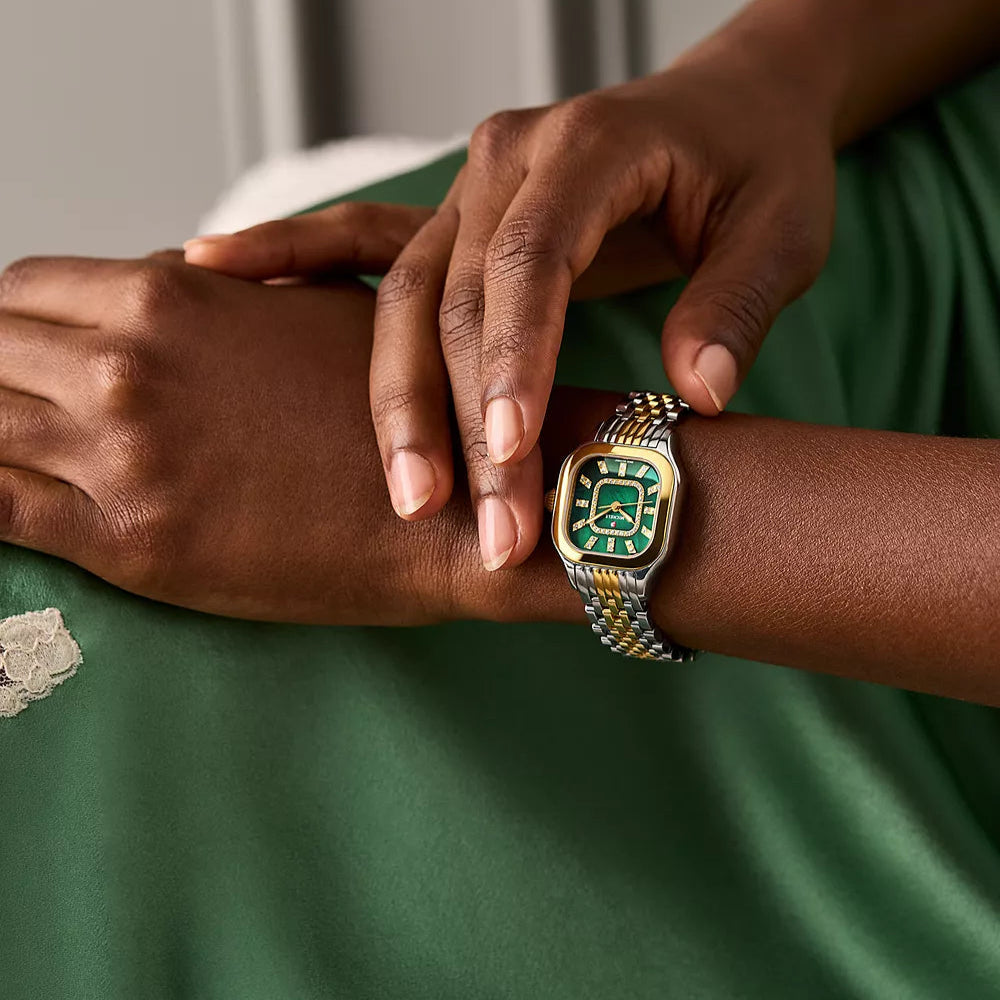 A striking blend of two-tone elegance and emerald-inspired radiance, the Meggie watch elevates every look with its sparkling detail.