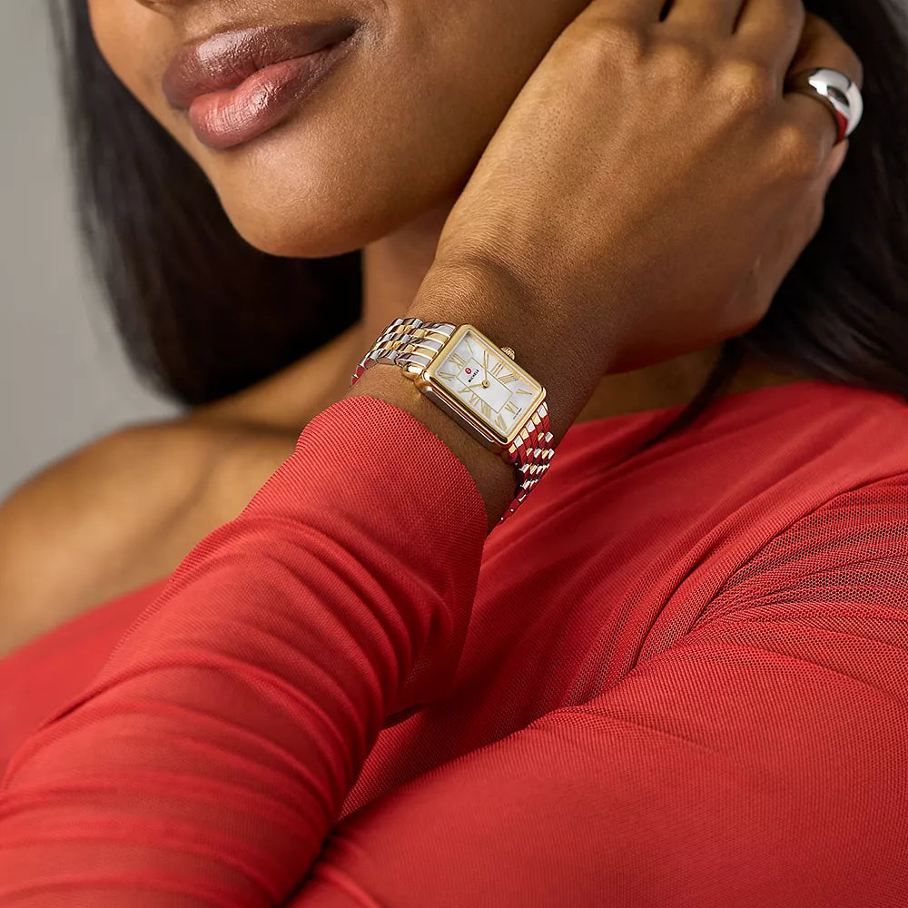 The two-tone 18K gold-plated bracelet, crafted exclusively for the Deco Park collection, offers both elegance and durability. Interchangeable with any 14 mm MICHELE strap, this watch effortlessly adapts to a variety of looks and occasions.