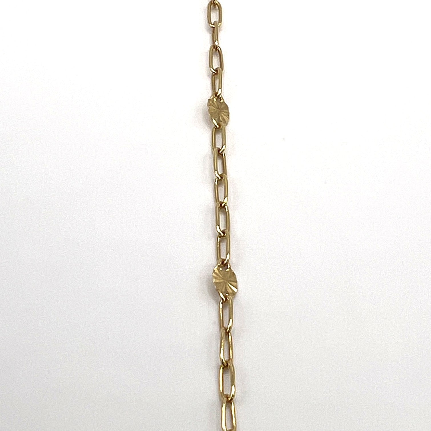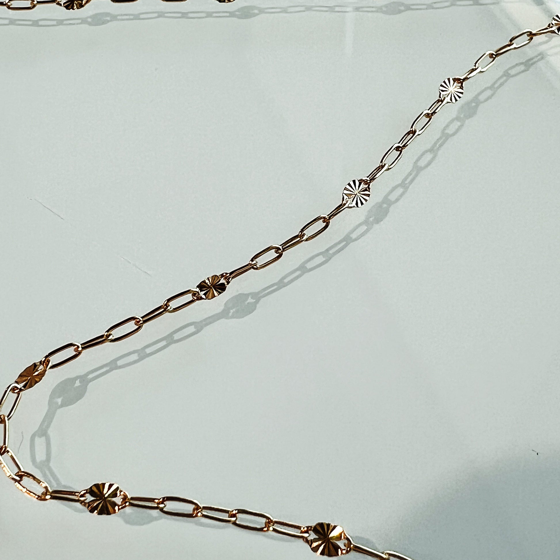 The Starburst Link Chain features intricately shaped links that fan out subtly, creating a textured, luminous effect. Eye-catching yet refined, it drapes smoothly along the neckline for everyday elegance.