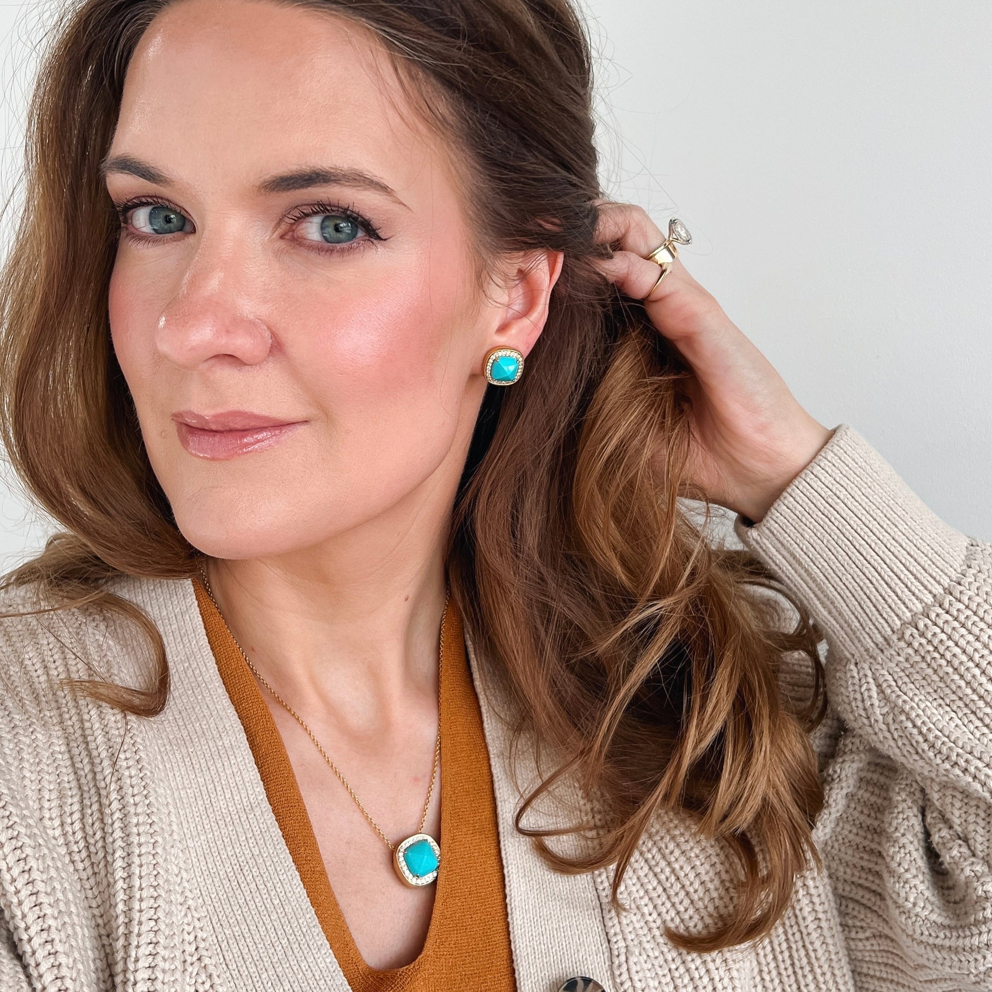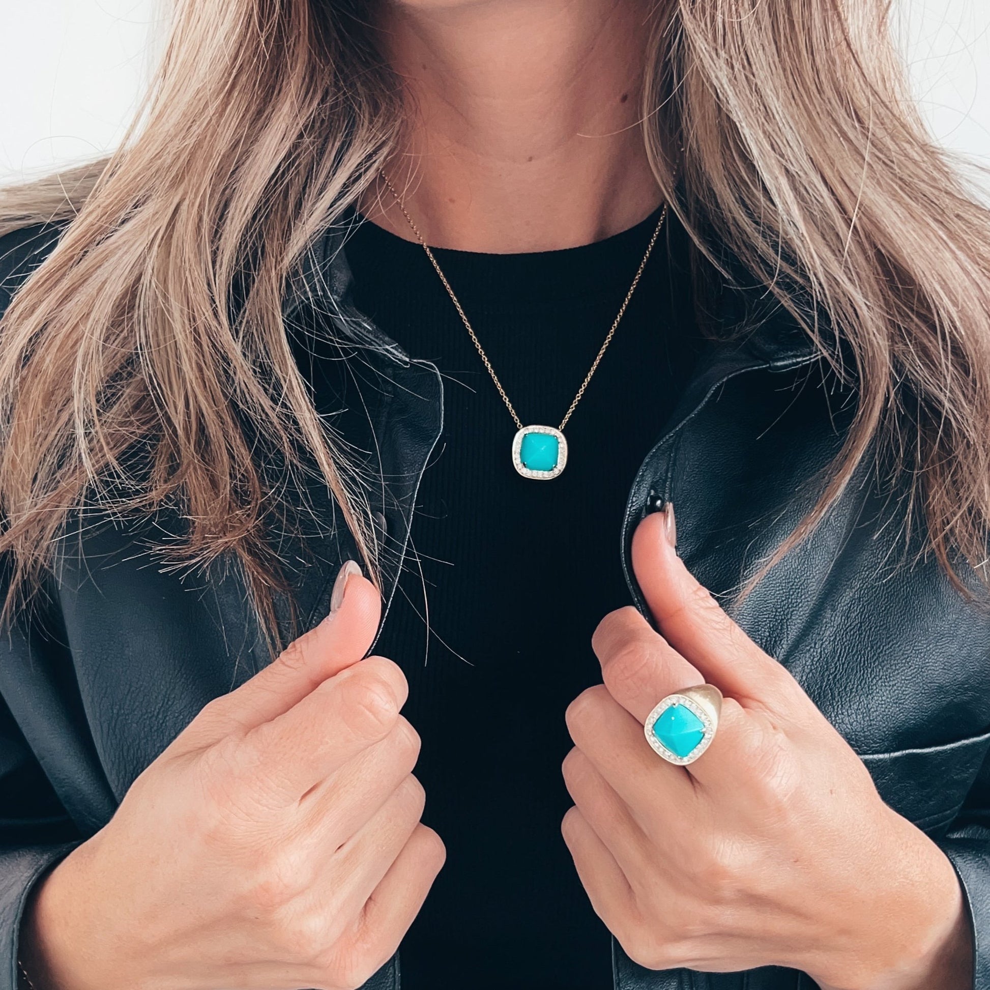 - Turquoise: 8.31 ct center stone, 0.48 ct diamonds