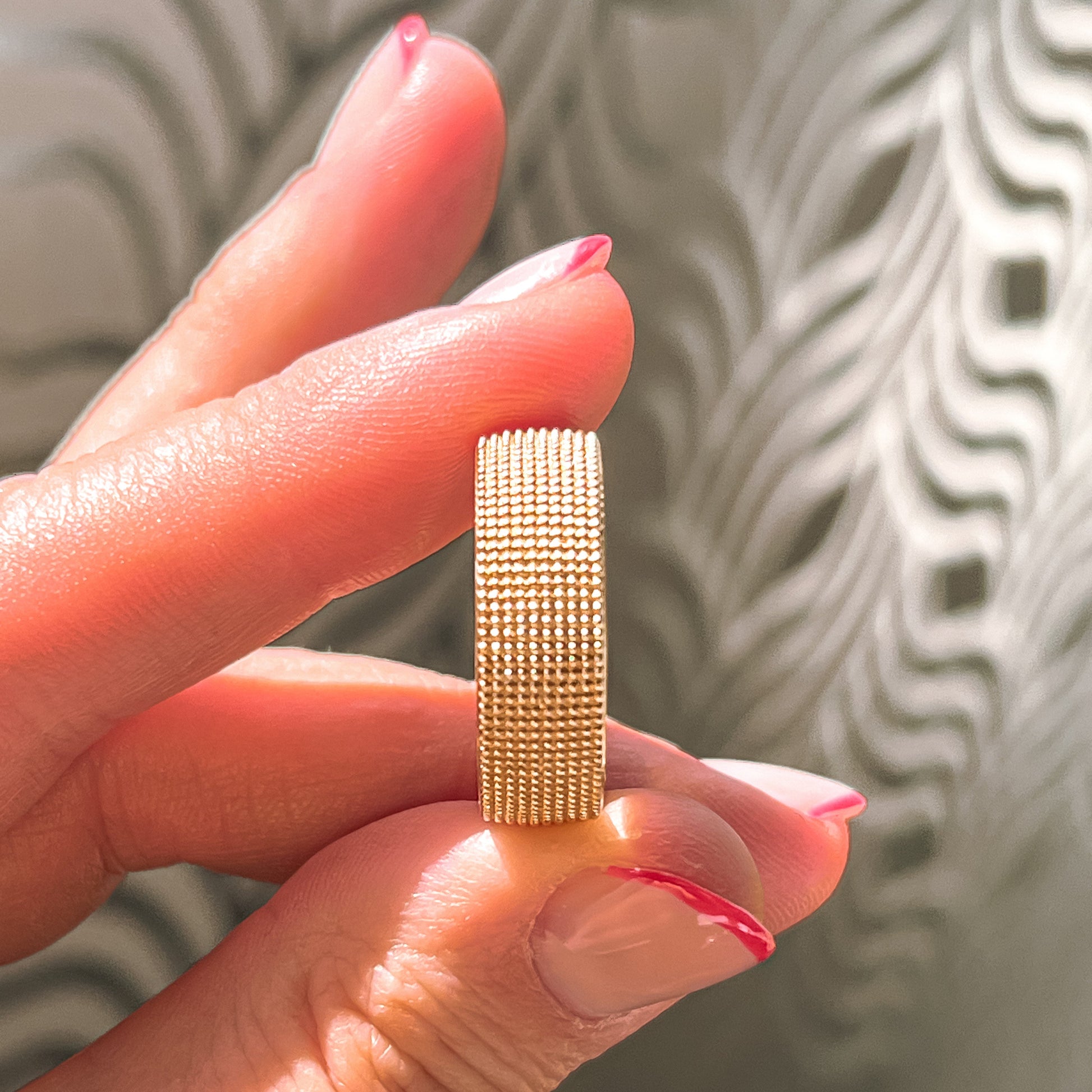 The Noam Carver 14K Yellow Gold men's band features a classic 7.5mm width with a dotted design, combining elegance and durability for the modern gentleman.