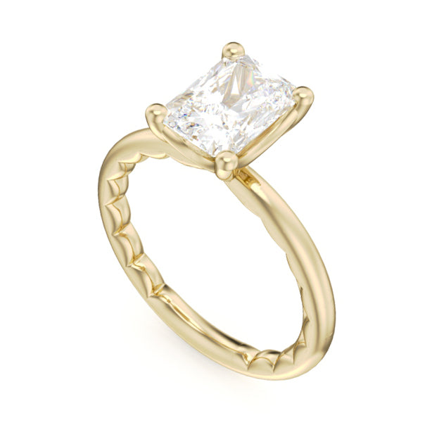 The Noam Carver "Luna" engagement ring in 14K yellow gold showcases a minimalist 1.8mm band that beautifully frames a dazzling 3.77ct radiant-cut lab-grown diamond. This design combines contemporary sophistication with timeless appeal, letting the brilliance of the center stone shine at every angle. The scalloping in the Luna band provides 1/4 size extra room for swelling, enhances comfort, and helps prevent the ring from turning.