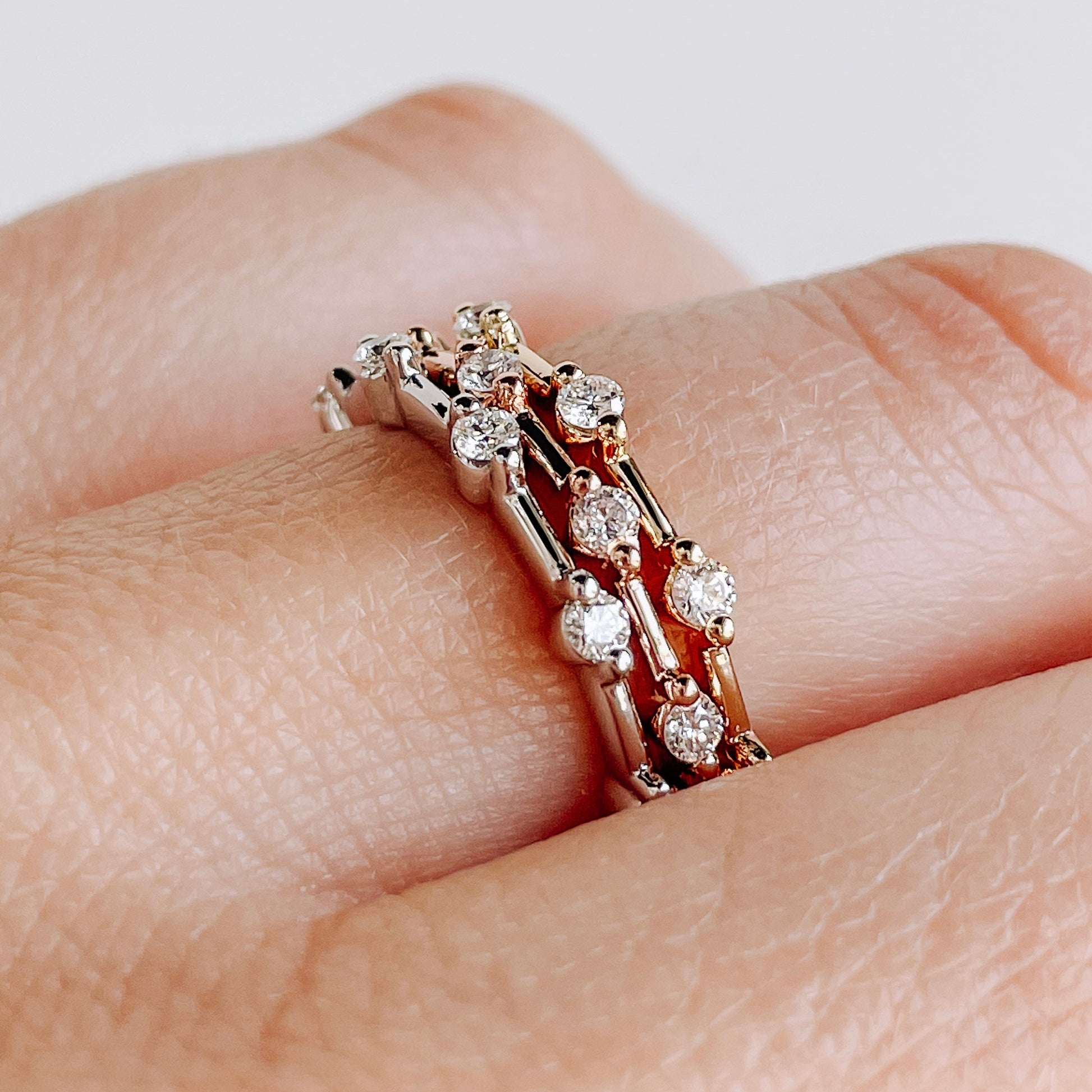 The Adly ring from ONE by Roset is crafted in 14k gold, featuring a slim 1mm band elegantly set with five round diamonds. This delicate design adds subtle brilliance, perfect for everyday wear or stacking.