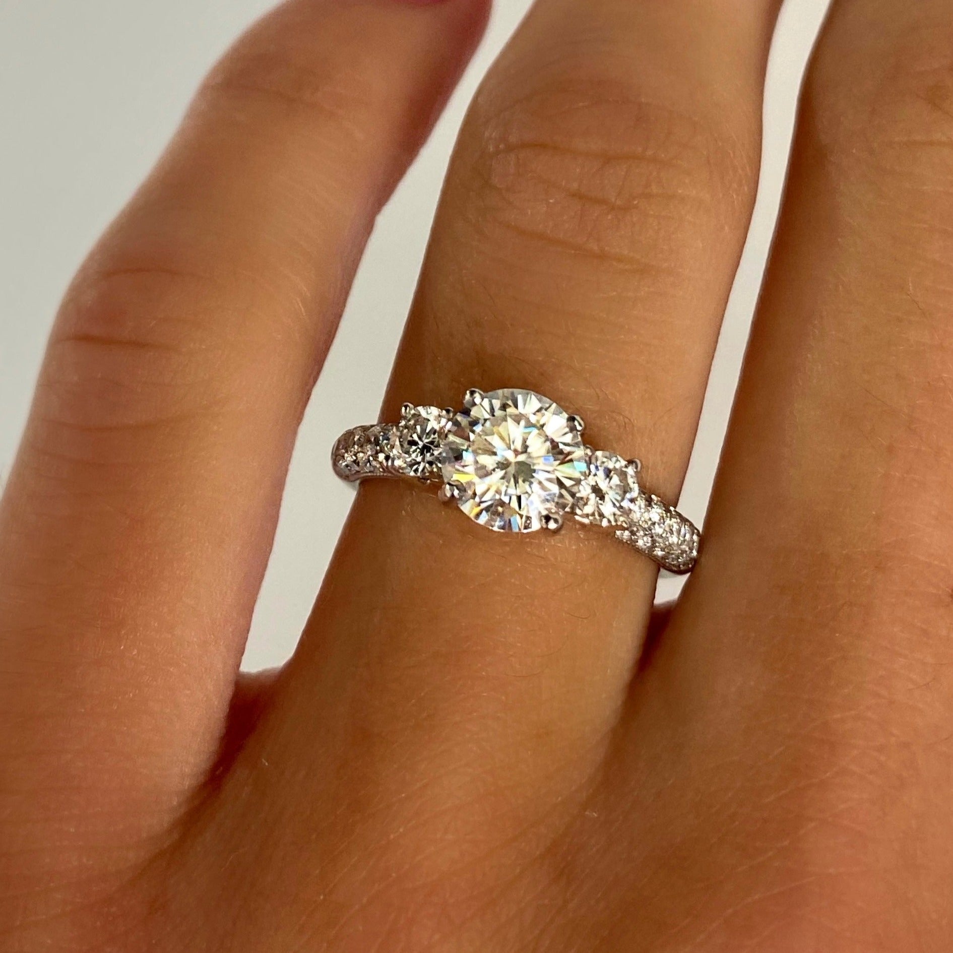 The Roset "Rhoda" engagement ring is a captivating piece crafted in 18K white gold. Featuring 0.66ct of dazzling accent diamonds along the pavé shoulders and two perfectly set side stones symbolizing the past and present, this ring is completed with a AAA Forever Brilliant Moissanite center, representing a radiant future.