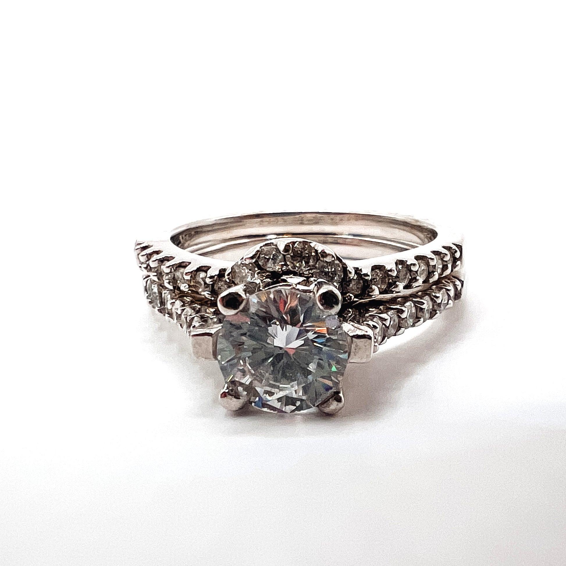 The Roset Wedding Set features a beautifully crafted 14K white gold band paired with a matching engagement ring showcasing a 1ct round cut center stone of your choice (not included). Designed to complement each other perfectly, this set offers both style and versatility.