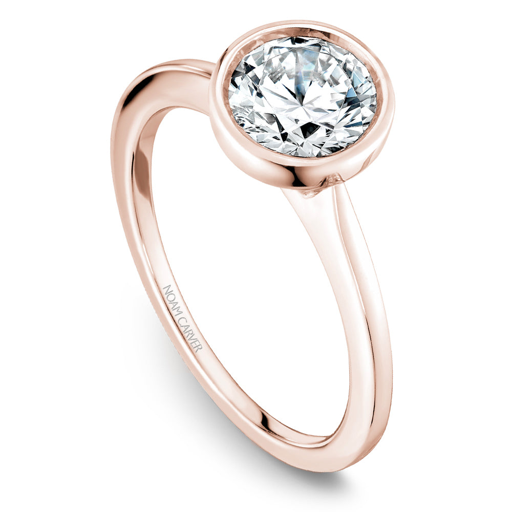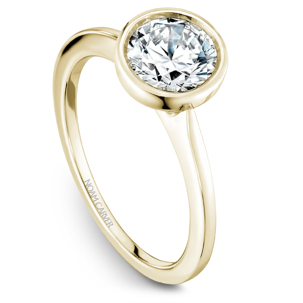 This solitaire bezel set engagement ring offers a modern, minimalist design that securely frames your chosen center stone in a smooth metal rim. Perfect for those seeking understated elegance with lasting durability.