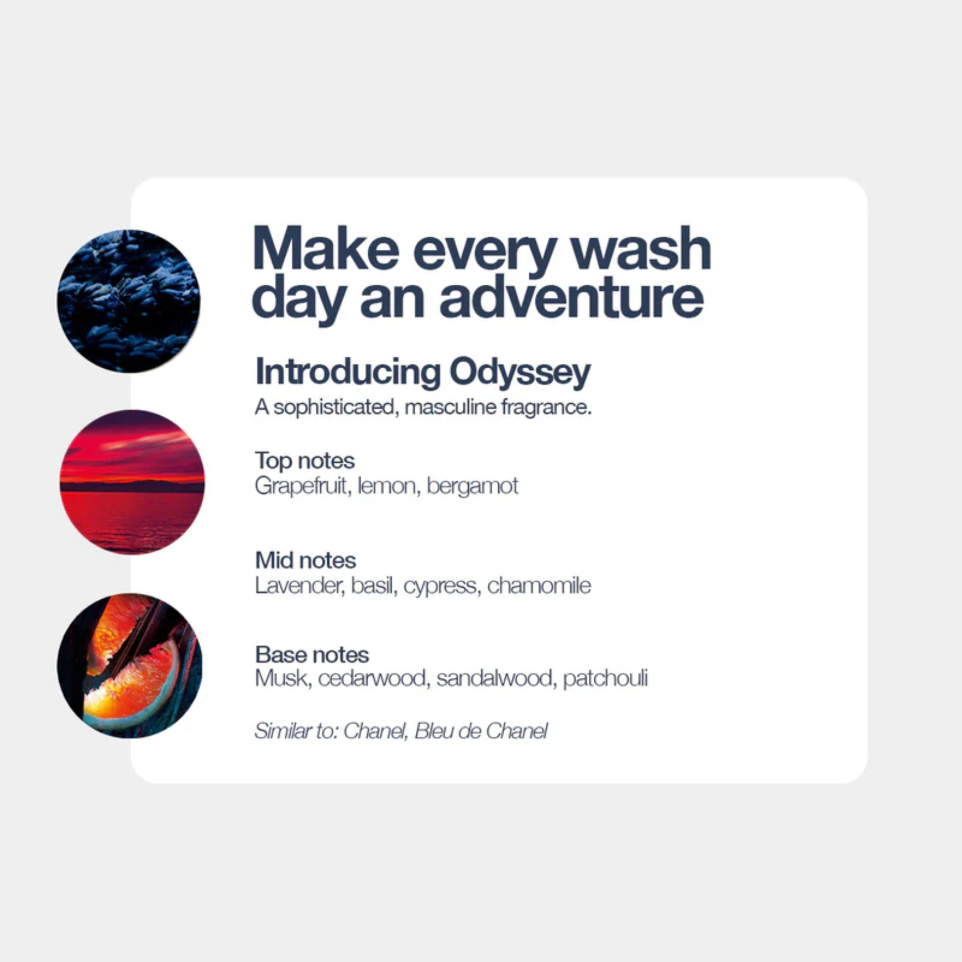 Introducing Odyssey, a fresh and invigorating laundry shampoo designed to elevate your wash day ritual. Infused with vibrant notes of grapefruit, lemon, bergamot, lavender, and cypress, layered with warm musk and cedarwood, this fragrance brings a crisp and calming experience to every load.