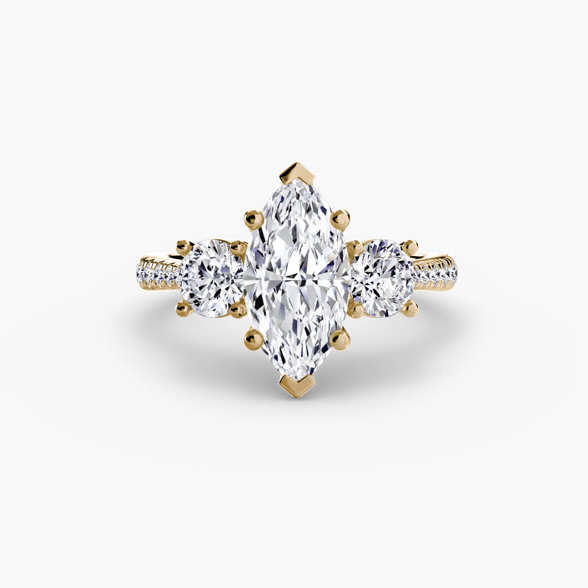 This elegant three-stone ring symbolizes your past, present, and future, elevated with a pavé band for extra sparkle and detail. A perfect union of meaning and brilliance.