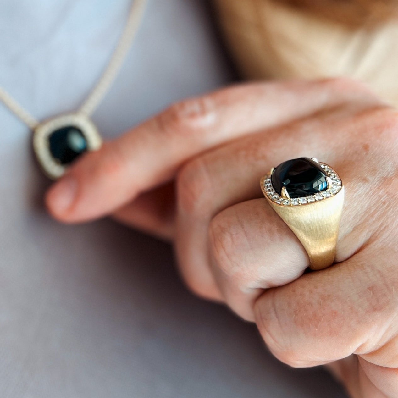 Inspired by nature’s boldest hues and timeless beauty, this ring offers a choice of striking Turquoise, luminous Mother of Pearl, or deep Black Onyx. Each stone is thoughtfully set and surrounded by delicate pavé diamonds, creating a piece that tells a story of elegance, individuality, and enduring sophistication.