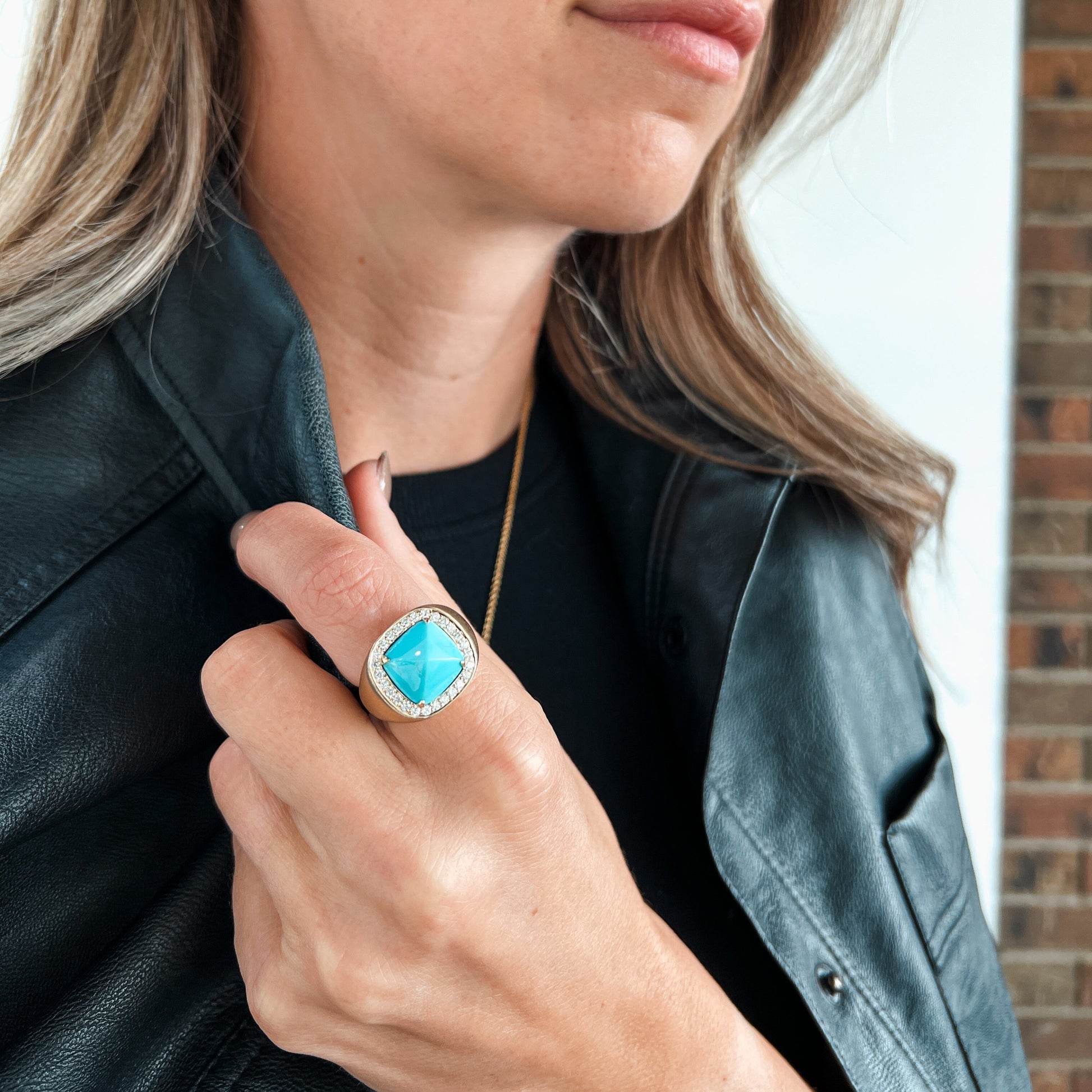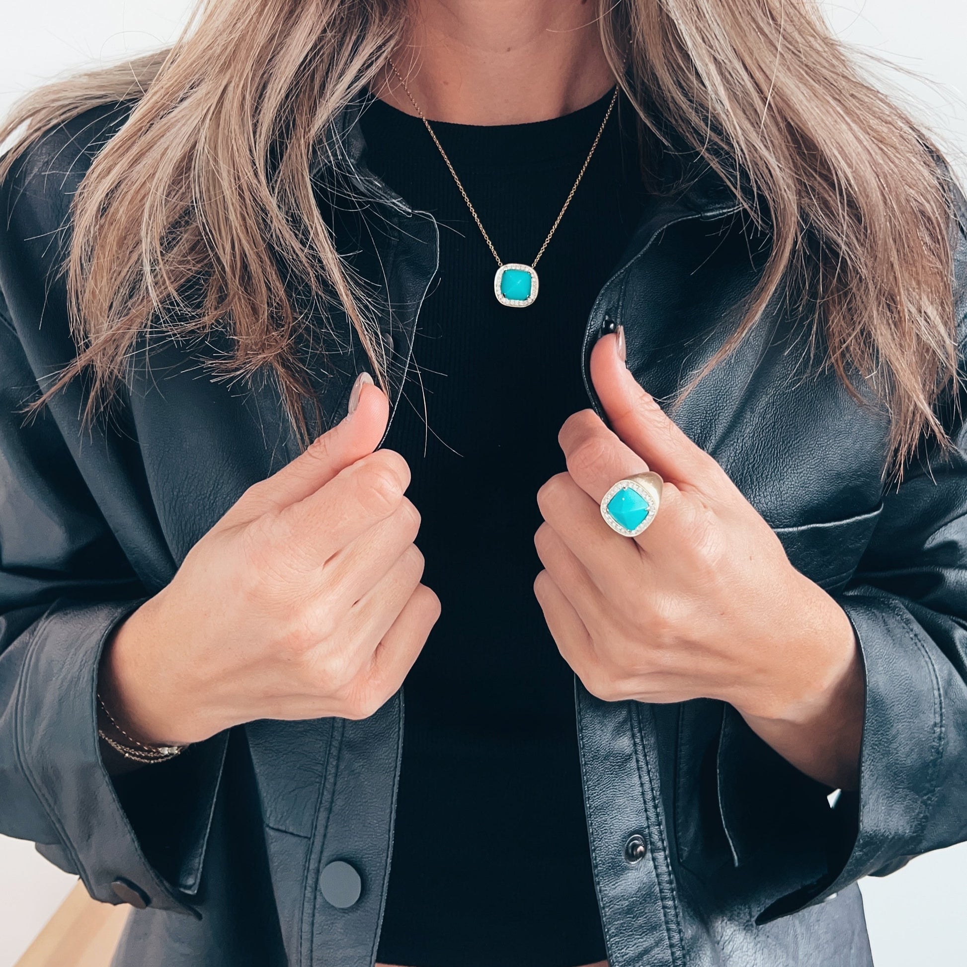 - Stones: Turquoise, Mother of Pearl, or Black Onyx center stone with pavé diamonds