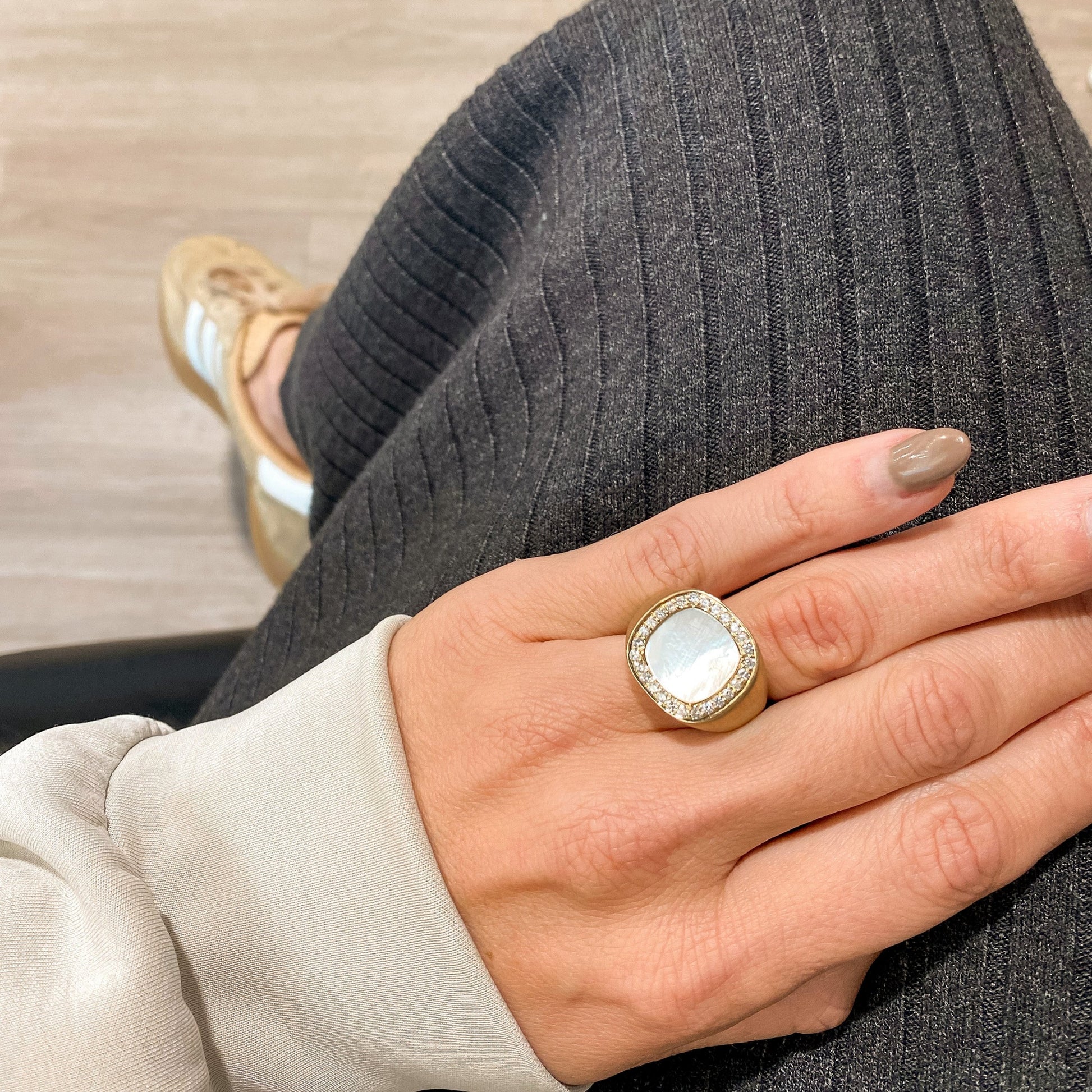 - Mother of Pearl: 5.09 ct center stone, 0.48 ct diamonds
