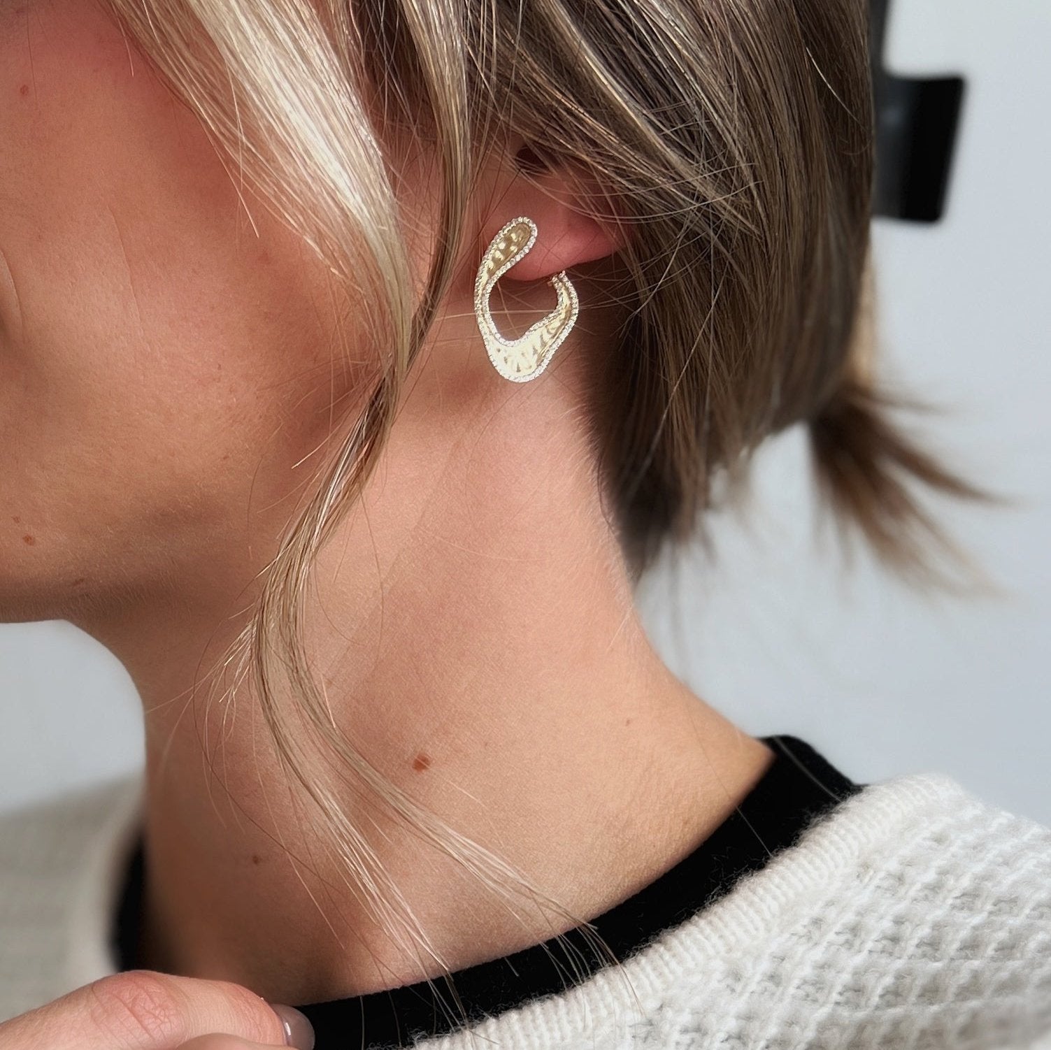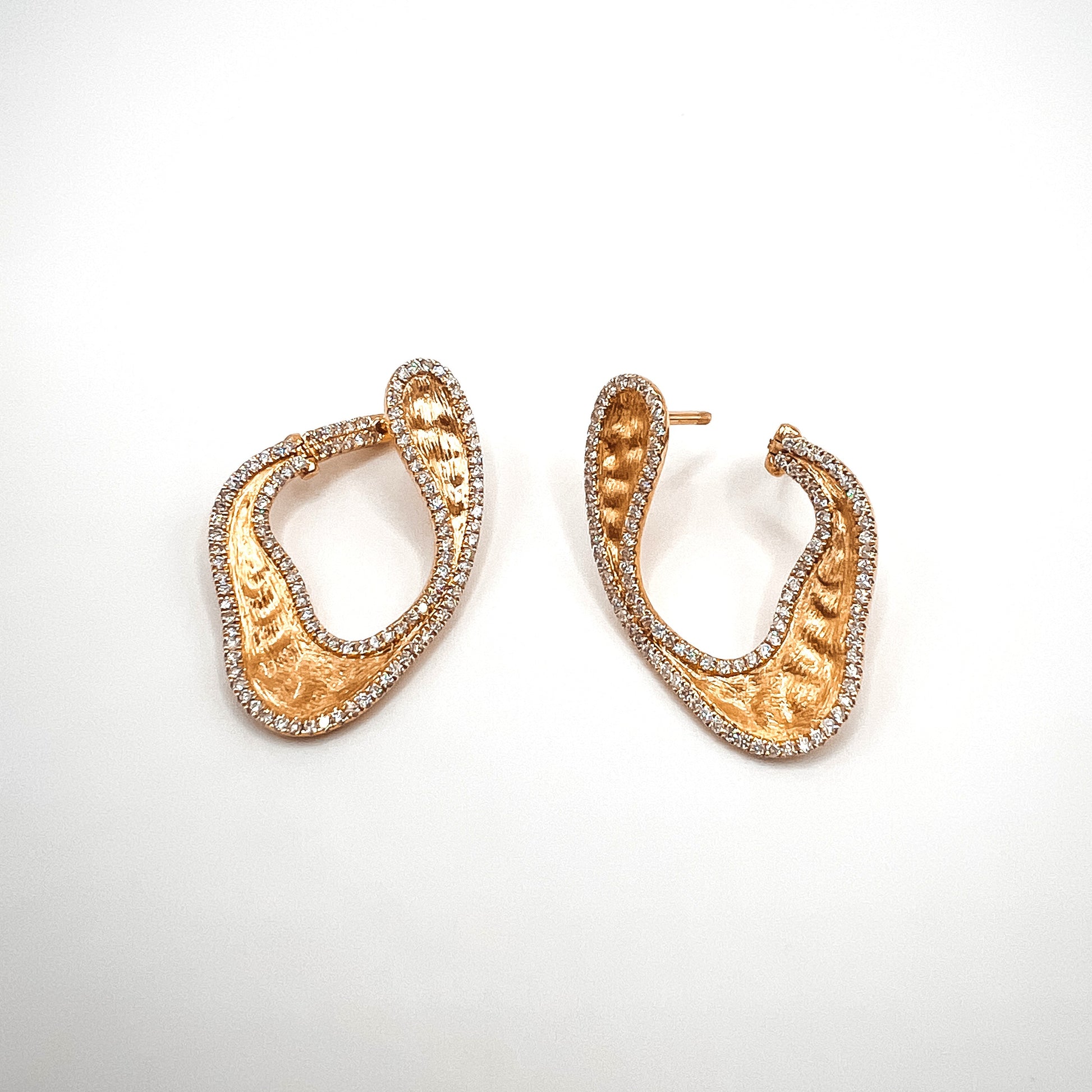 Discover elegant refinement with the "Whitney" hoops, meticulously crafted in 14k recycled yellow gold. Their textured surface enhances dimension, while the precisely set diamonds emit a stunning radiance. These earrings are the perfect choice to enhance your style with subtle elegance.